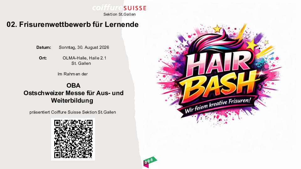 Vom 27. bis 30. August 2026 präsentiert sich coiffureSUISSE SG an der Ostschweizer Bildungs-Ausstellung OBA in St. Gallen. Am grössten Bildungstreffpunkt der Ostschweiz informieren sich jährlich über 20’000 Besucher*innen über 250 Berufe und 600 Weiterbildungsangebote.